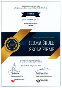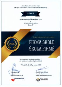 Jsme hrdí, že jsme byli mezi 26 nominovanými dvojicemi středních škol a firem v soutěži Firma škole – Škola firmě 2025, kterou pořádal Královéhradecký kraj a Krajská hospodářská komora. Toto ocenění podporuje spolupráci mezi školami a firmami a ukazuje, jak důležité je propojení teorie s praxí. Děkujeme všem partnerům za podporu a inspiraci.