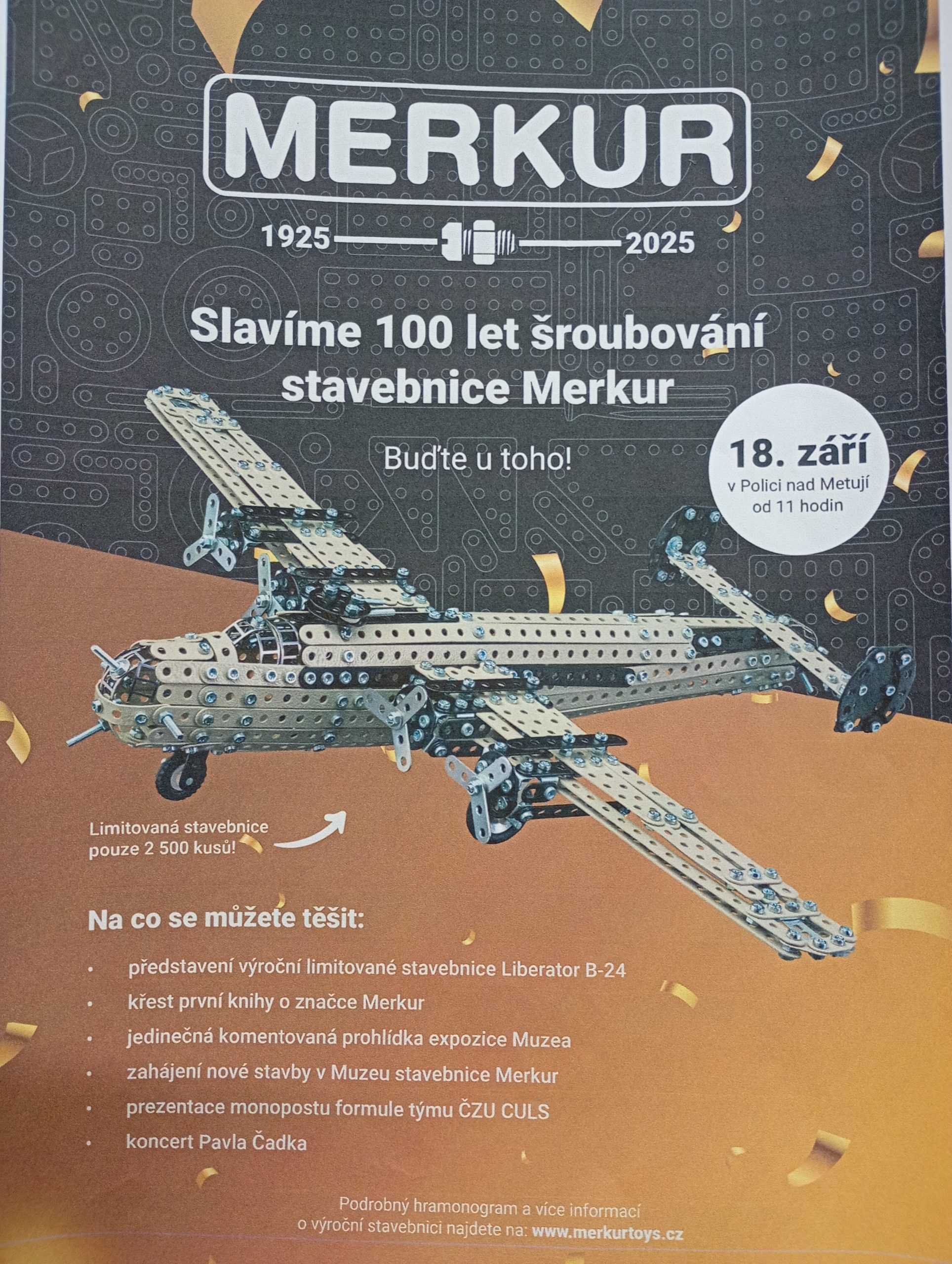 Dne 18.9. 2025 jsme byli pozváni na 100-leté výročí stavebnice MERKUR do Police nad Metují. Prezentovali se zde i jiné školy ze širokého okolí. Celý den v muzeu Merkur probíhaly komentované prohlídky železných a papírových modelů. K vidění byla i junior Formule ( monopost formule týmu CULS, Prague formula racing ČZU), kterou předváděli na uzavřené komunikaci. Proběhl zde křest stavebnice Merkur vojenského letadla LIBERATOR s pořadovým číslem 1 podepsaná vojenským generálem a poté se uskutečnila její dražba.